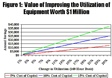 Figure 1 demonstrates the value of improving the equipment utilization for $1 million worth of equipment. As an example, if your plant has $25 million of capital and equipment invested at a 10% cost of capital, you could realize a savings of $550,000/year by changing from 5-days to 7-days a week.
