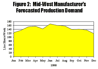 Many manufacturing companies experience variable workloads due to changes in product demand, or variable staffing availability due to vacations and illness. For example, Figure 2 shows the weekly operating hours needed to meet the production demand for one year at a Mid-Western manufacturer.