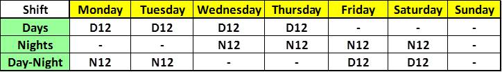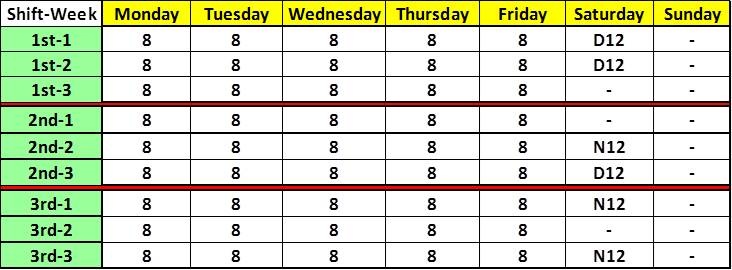 Now to get a full weekend off with the smallest departure from “simple” you must work 12-hour shifts on two out of every three weekends. The third weekend is off.