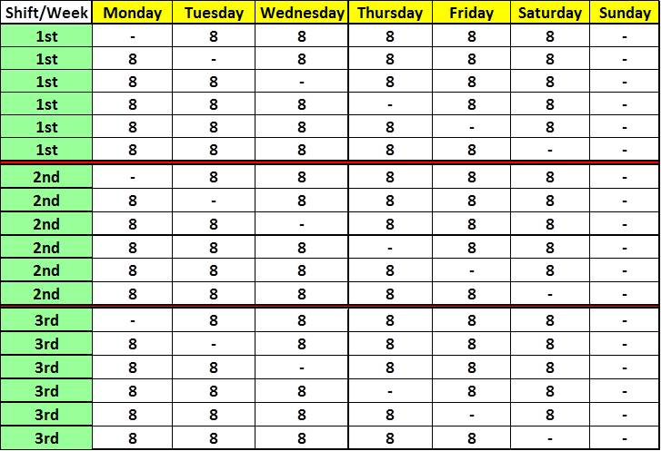 This next schedule is an attempt to keep things simple and yet, still, give the employees a full weekend off once every three weeks. “Keeping things simple” basically says, work everyone for 6 days in a row, all 8-hour shifts. The workforce might not like this. Alertness, safety, and productivity will suffer; but it’s “simple.”