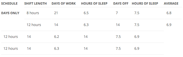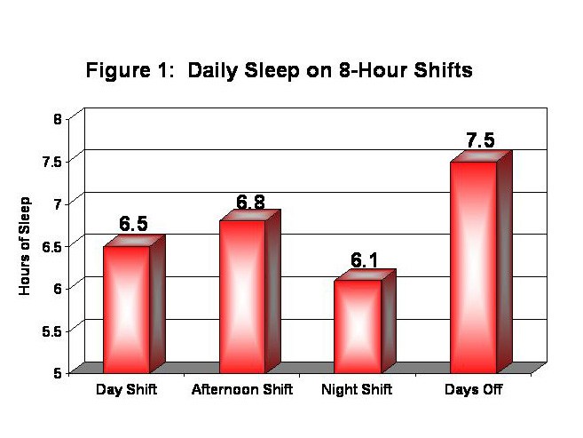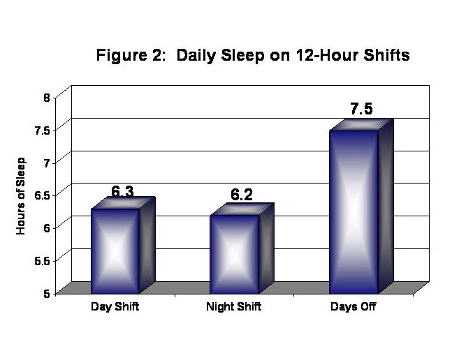 At first glance, it appears that the people working 12-hour shifts get less sleep than those on 8-hour shifts. But this is not the case over a span of several days or weeks, due to the fact that 12-hour shifts provide twice as many days off and employees sleep longer on their days off. Figure 3 shows the average hours of sleep over a four-week period. Regardless of whether you compare someone working day shifts only, night shifts only, or a rotating shift schedule, the average hours of sleep over the four week period is greater on 12s.