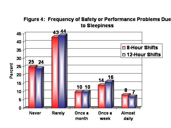 There have been a number of articles written about safety risks with 8-hour shifts vs. 12-hour shifts. The results are mixed. Although our shift workers surveys rely on self-reported safety problems rather than documented incidents, the survey results suggest that longer shifts are at least as safe as 8-hour shifts, as shown in Figure 4.