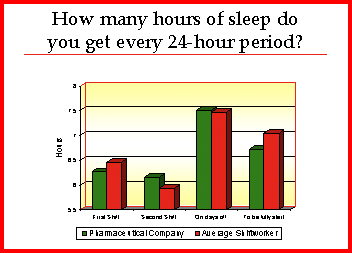 Finally, we help you evaluate the survey results. The report also includes an analysis of the data. For example, what does it mean when your company’s employees rate the company lower on communications than other shift workers (nationwide) or should you panic if your workforce is only sleeping 6.5 hours every twenty-four hours when assigned to the night shift?